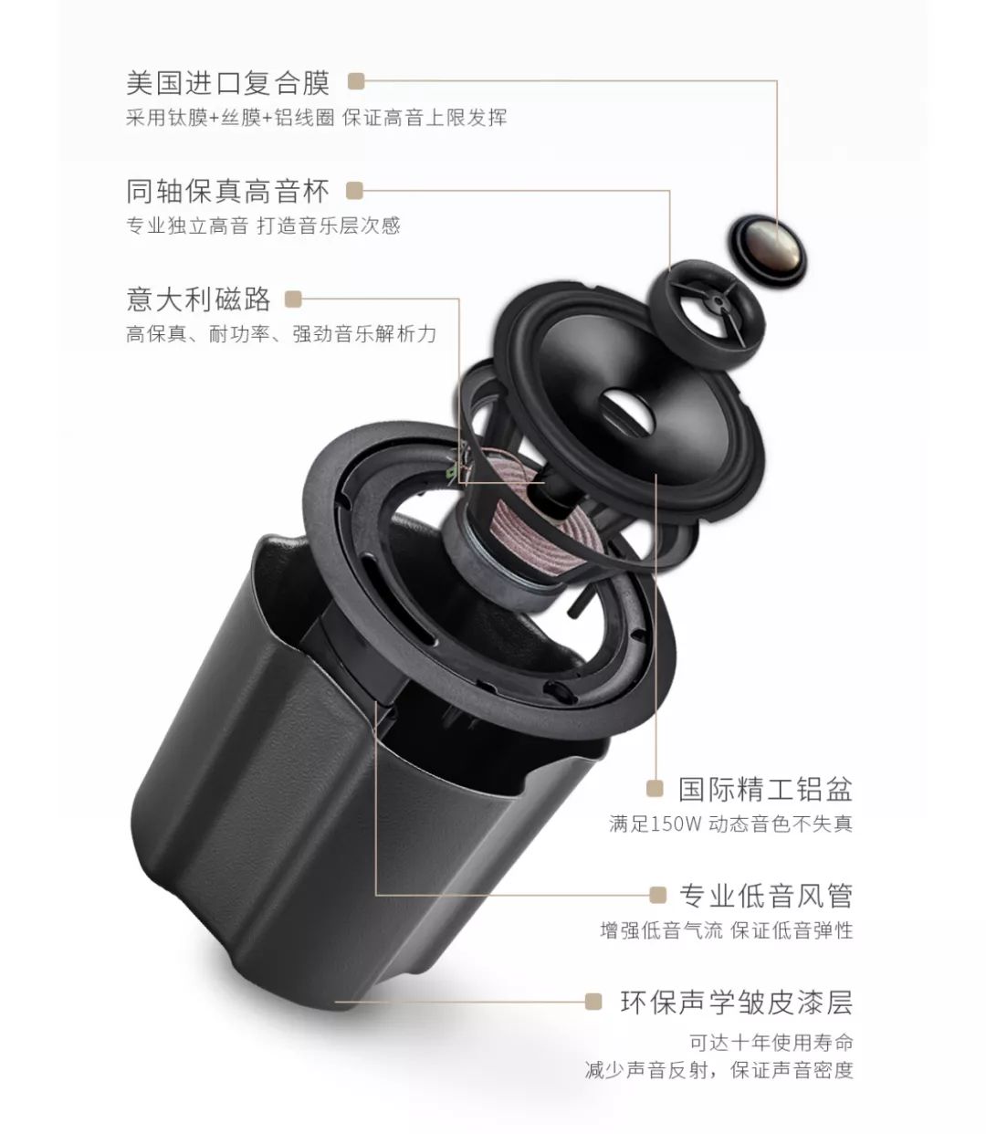 从全铝喇叭到PP复合石墨烯喇叭,从普通磁路到艺术品级的意大利磁路,VILLIS从不放过能够提升音质的任何一个小部件,一点点深挖、一步步尝试,永远怀抱着从“功能性音响向发烧级音响递进”的目标,让音质无限接近完美,最终实现了目前的音质标准。